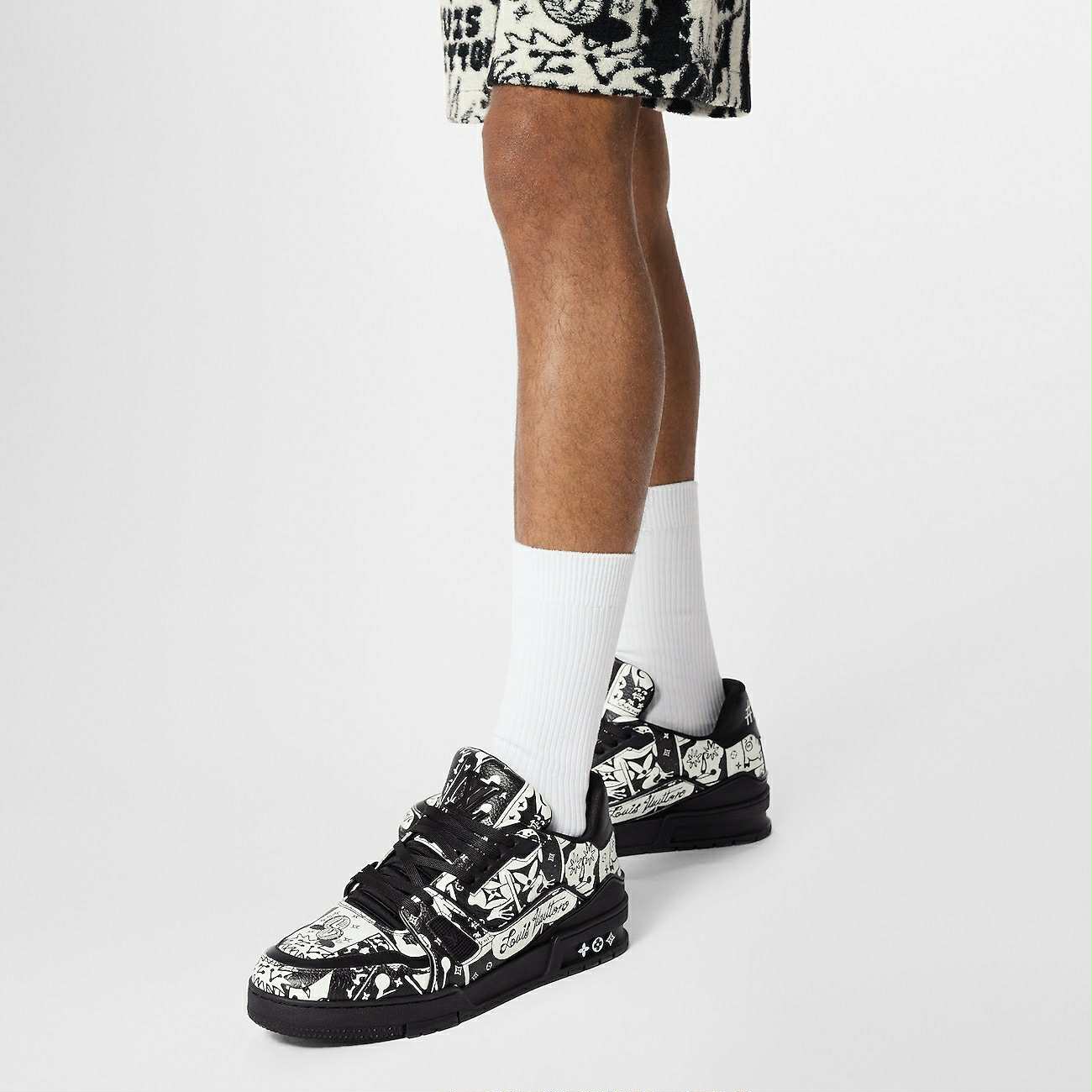 Được lấy cảm hứng từ những đôi giày bóng rổ cổ điển, LV Trainer nay khoác lên mình họa tiết truyện tranh trên nền da bê thật , tạo nên sự kết hợp hiếm có giữa nghệ thuật và thời trang. Đây không chỉ là một đôi giày, mà là lời tuyên ngôn cho gu thẩm mỹ đẳng cấp.
